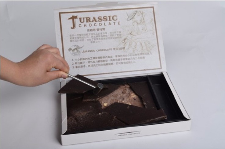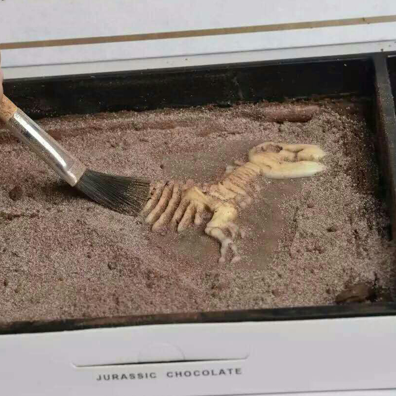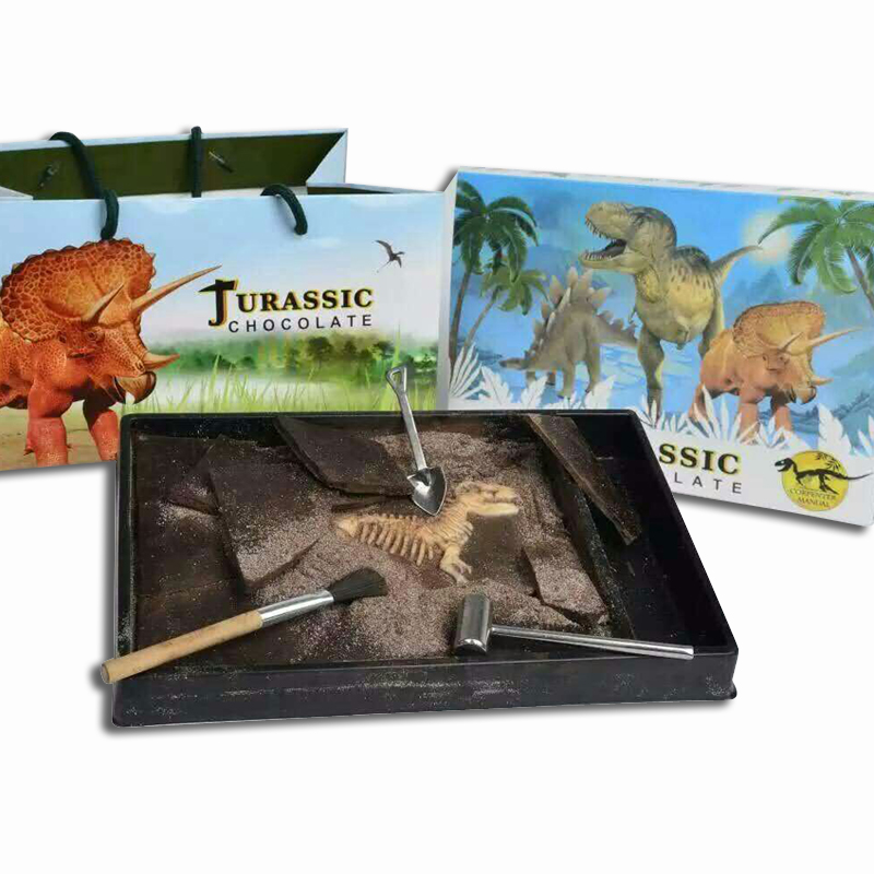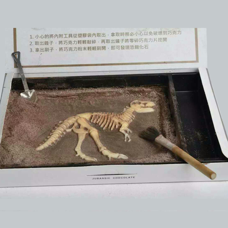 台湾考古巧克力,可以考古,可以玩,白巧克力、黑巧克力和巧克力沙组成,太有创意的送人礼物了,默认发顺丰快递量大价优哦。 一、除了工具的所有,都是巧克力做的。化石是白巧克力,砖块是黑巧克力,沙子土壤是可可粉。 二、款式分别有:霸王龙,三角龙和剑龙