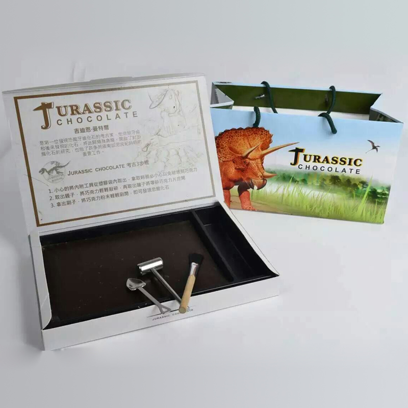 台湾考古巧克力,可以考古,可以玩,白巧克力、黑巧克力和巧克力沙组成,太有创意的送人礼物了,默认发顺丰快递量大价优哦。 一、除了工具的所有,都是巧克力做的。化石是白巧克力,砖块是黑巧克力,沙子土壤是可可粉。 二、款式分别有:霸王龙,三角龙和剑龙